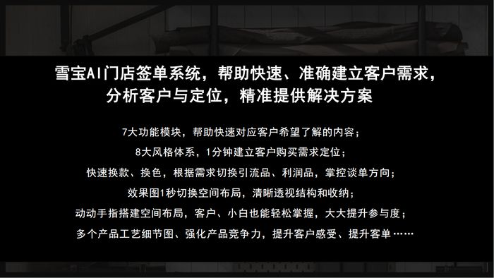 雪宝门店AI签单系统:可谓终端的“效率加快器”以“六步成交法”方案展现、花色选择、布局定制到订金收取的全流程,“小白可操做”的拼积木式设想功能,让导购、木匠以至业从都能参取方案搭建,不只将签单周期缩短60%,更能通过多价钱系统展现、工艺细节图呈现,无效提拔客单价。